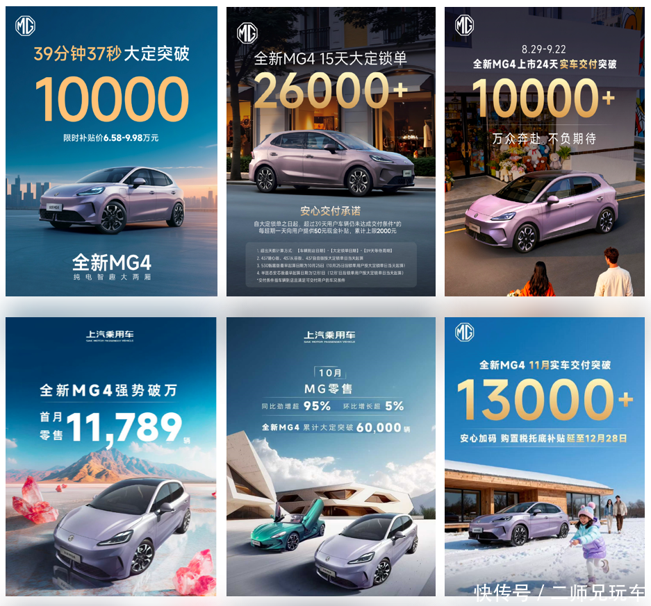 这其中,全新MG4起到了至关重要的作用。这款车通过热销开局,上市15天大定2.6万,2025年10月交付11480辆,11月交付13574辆。截至2025年12月,全新MG4累计大定已超8万辆,稳居纯电车型销量榜前列。