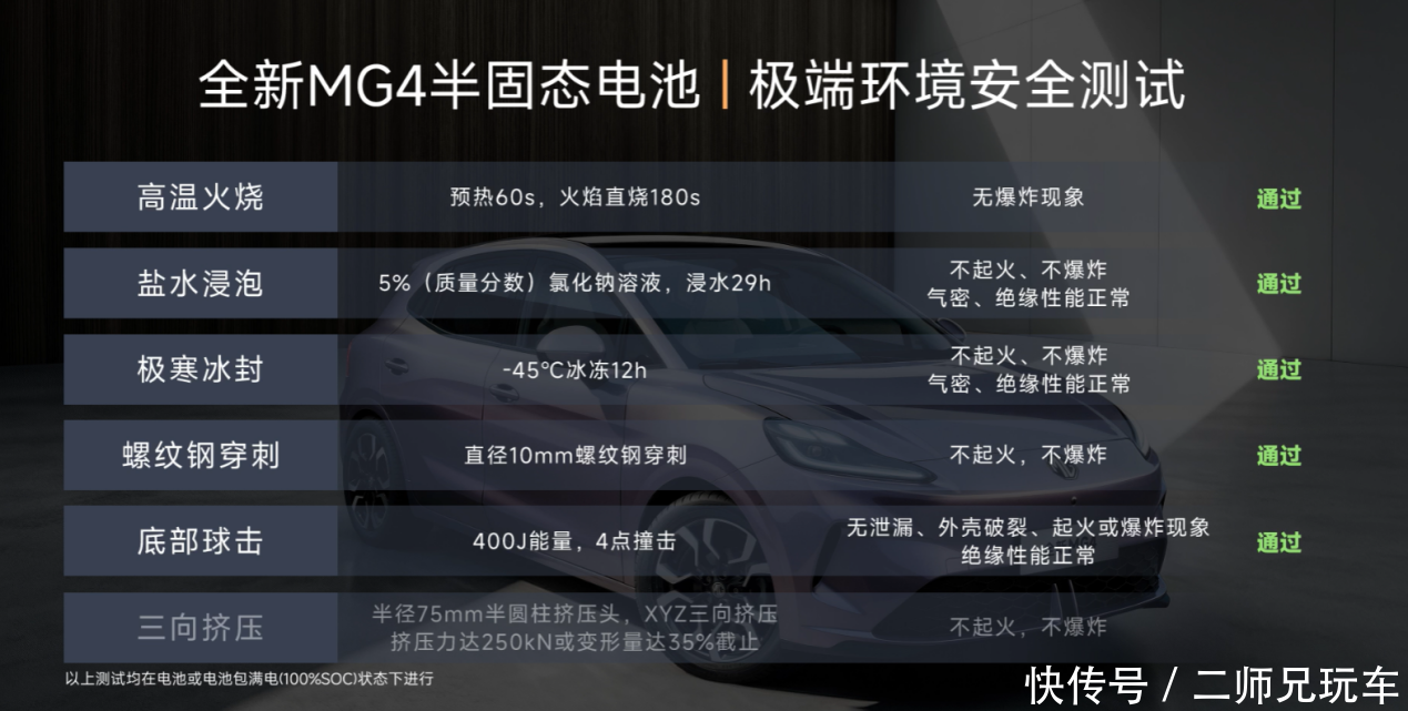 国家级权威测试机构中汽中心曾经对全新MG4半固态电芯开展的安全测试,涵盖螺纹钢穿刺、三向挤压、盐水浸泡、极寒冰冻、底部球击、高温火烧六大极端工况,每项测试标准均超越行业最高水平至少20%,MG4用实测数据回应了用户最关心的安全痛点。