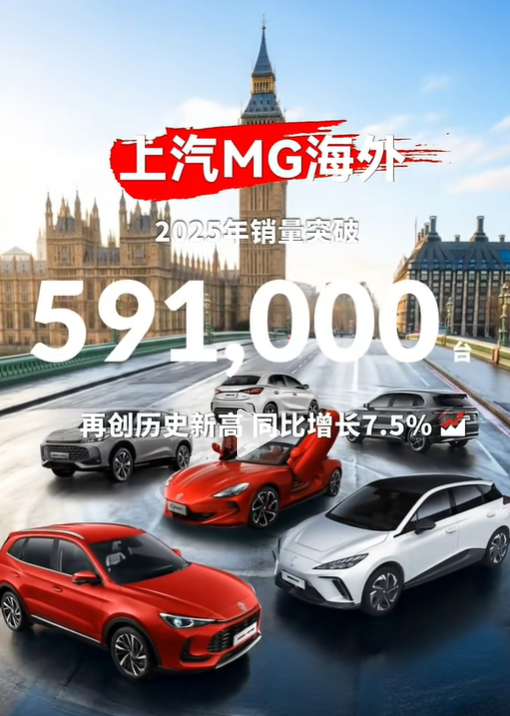 2025年全年,MG品牌海外销量达到了59.1万辆,同比增长7.5%,再创历史新高。