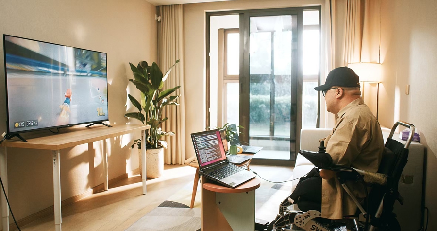 2025年4月30日,在位于上海的受试者住所,受试者通过脑机接口玩赛车游戏。 (新华社发)